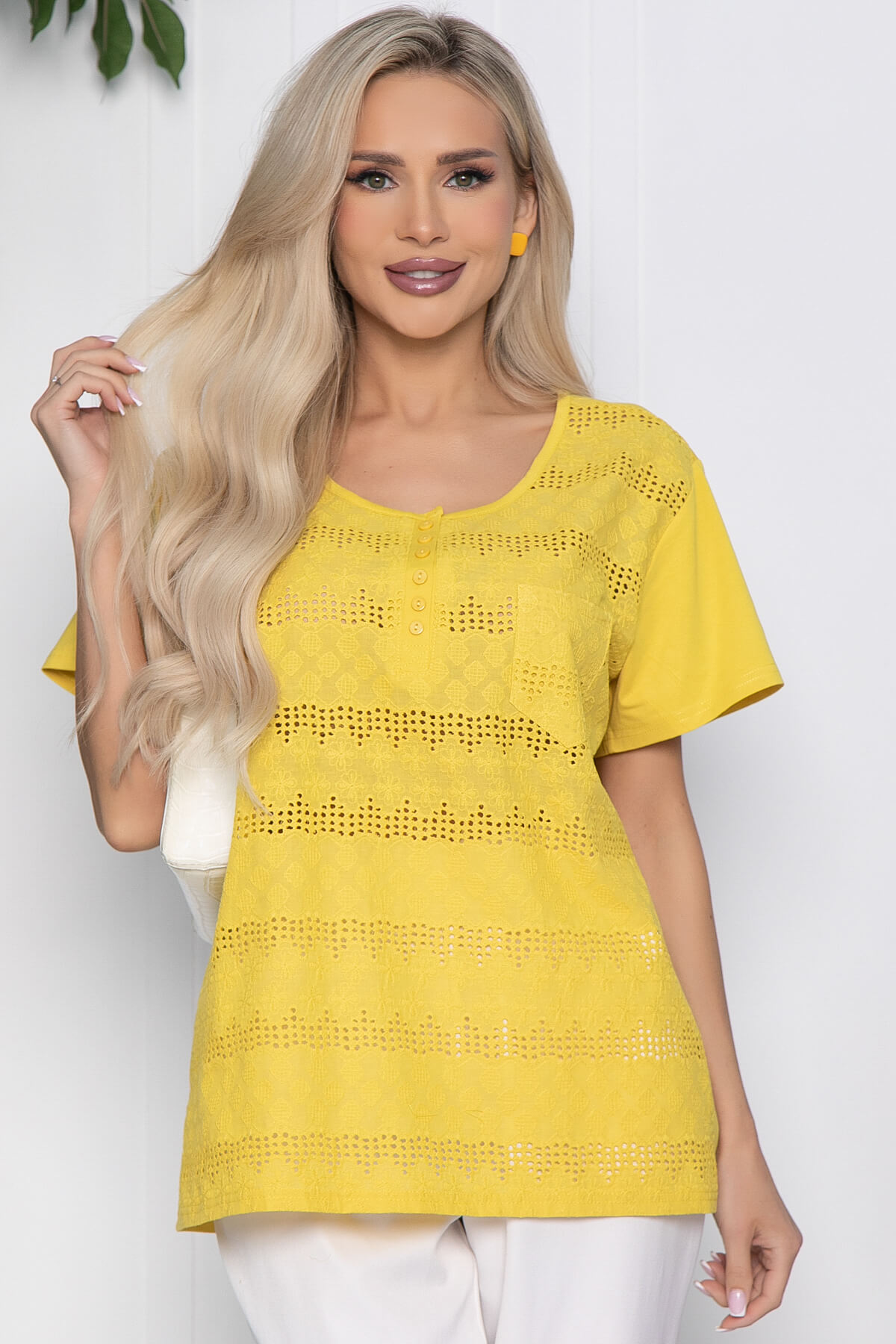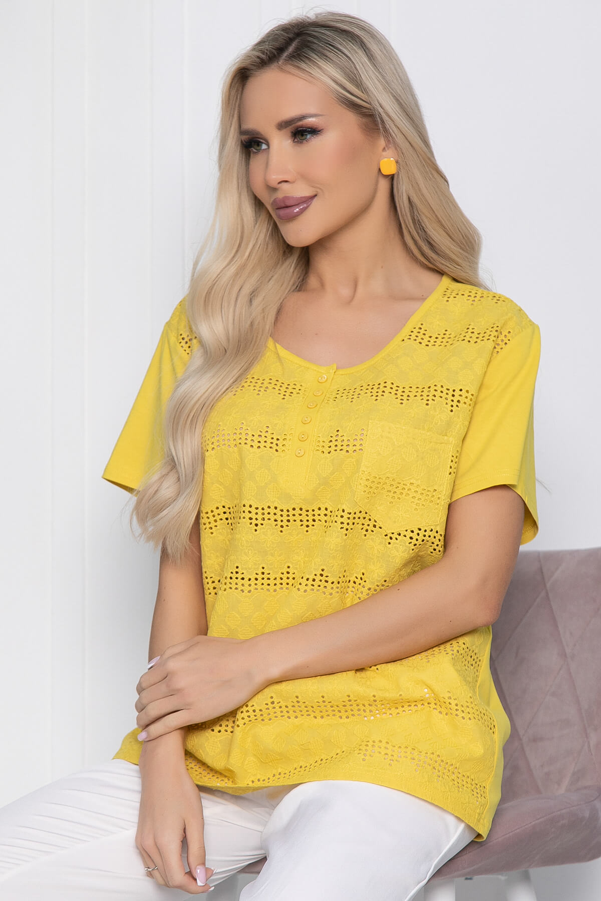 Своей легкостью и комфортностью блузка на лето будет идеальным сопровождением для вашего отдыха на свежем воздухе, на прогулке по городу или в отпуске. Блузка с карманом на груди и имитацией пуговиц.