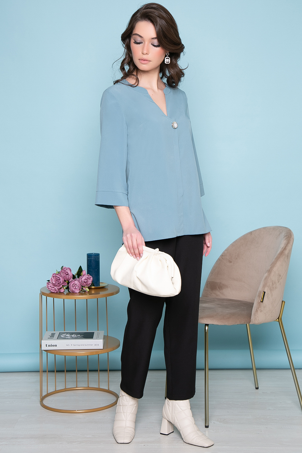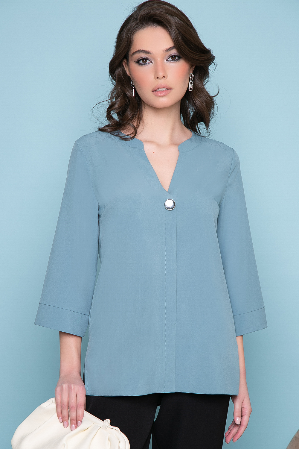 Блуза для создания элегантных классических и вечерних образов. Изящный V-образный вырез горловины украшен золотой пуговицей. Рукав втачной, три четверти, на широкой манжете. По бокам блузы разрезы.