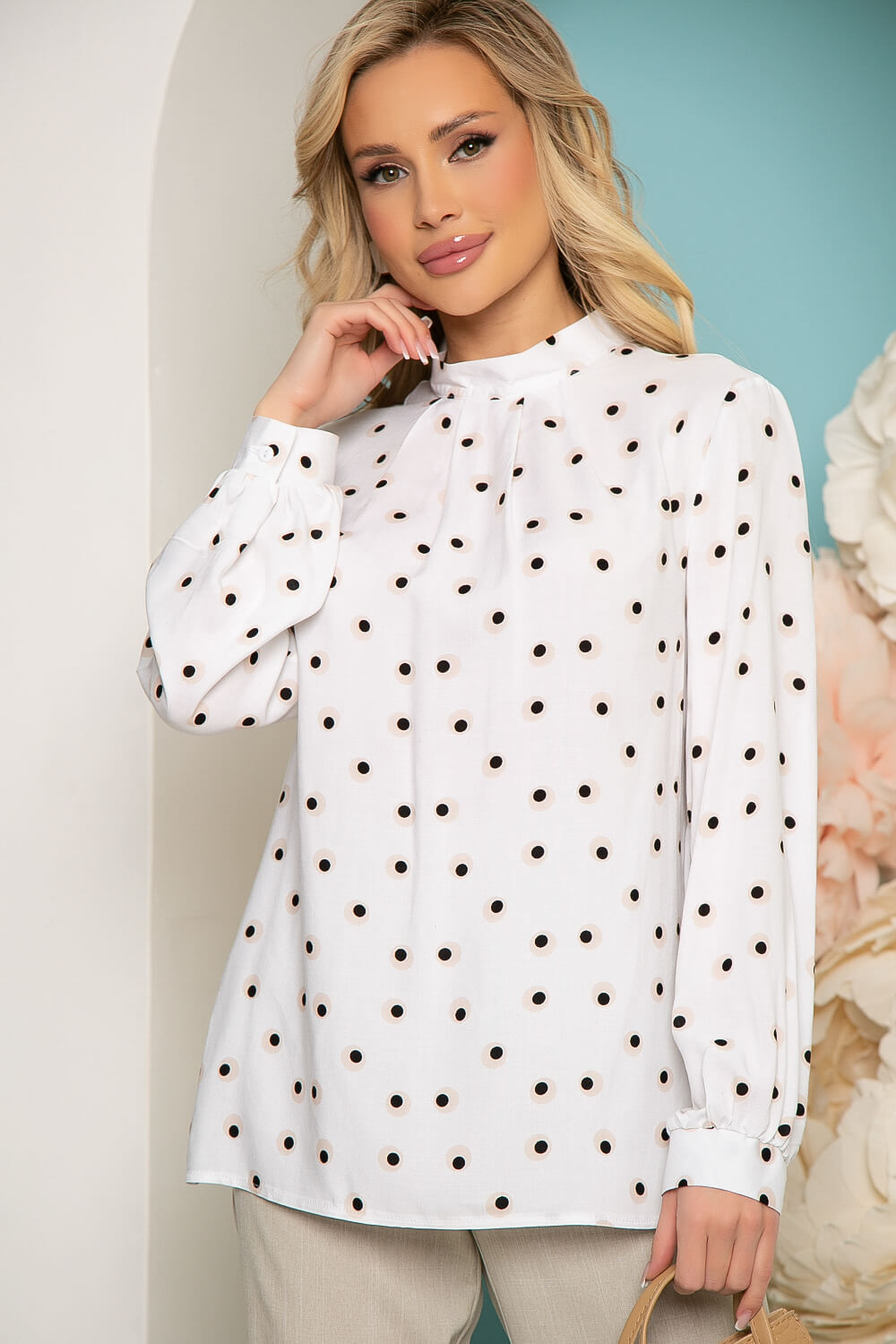 Базовая блуза женственного кроя из штапеля создана для нежных летних образов. Модель в классическом оттенке идеально вписывается в любую обстановку от офисных будней и до праздничных мероприятий. Воротник-стойка, сзади застёгивается на петлю-пуговицу, по переду защипы. Блуза свободного кроя, рукав втачной, длинный, на манжете.