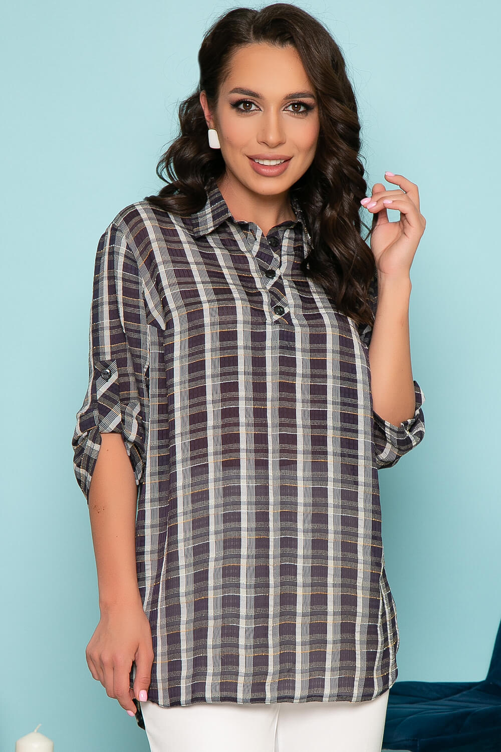 Невесомая блуза-флюид с принтом клетка блуза свободного кроя. Блуза с удлиненной спинкой, края скруглены, по бокам разрезы. Классический отложной воротничок, по переду застёгивается на пуговицы. Рукав три четверти, застёгивается на пату.
