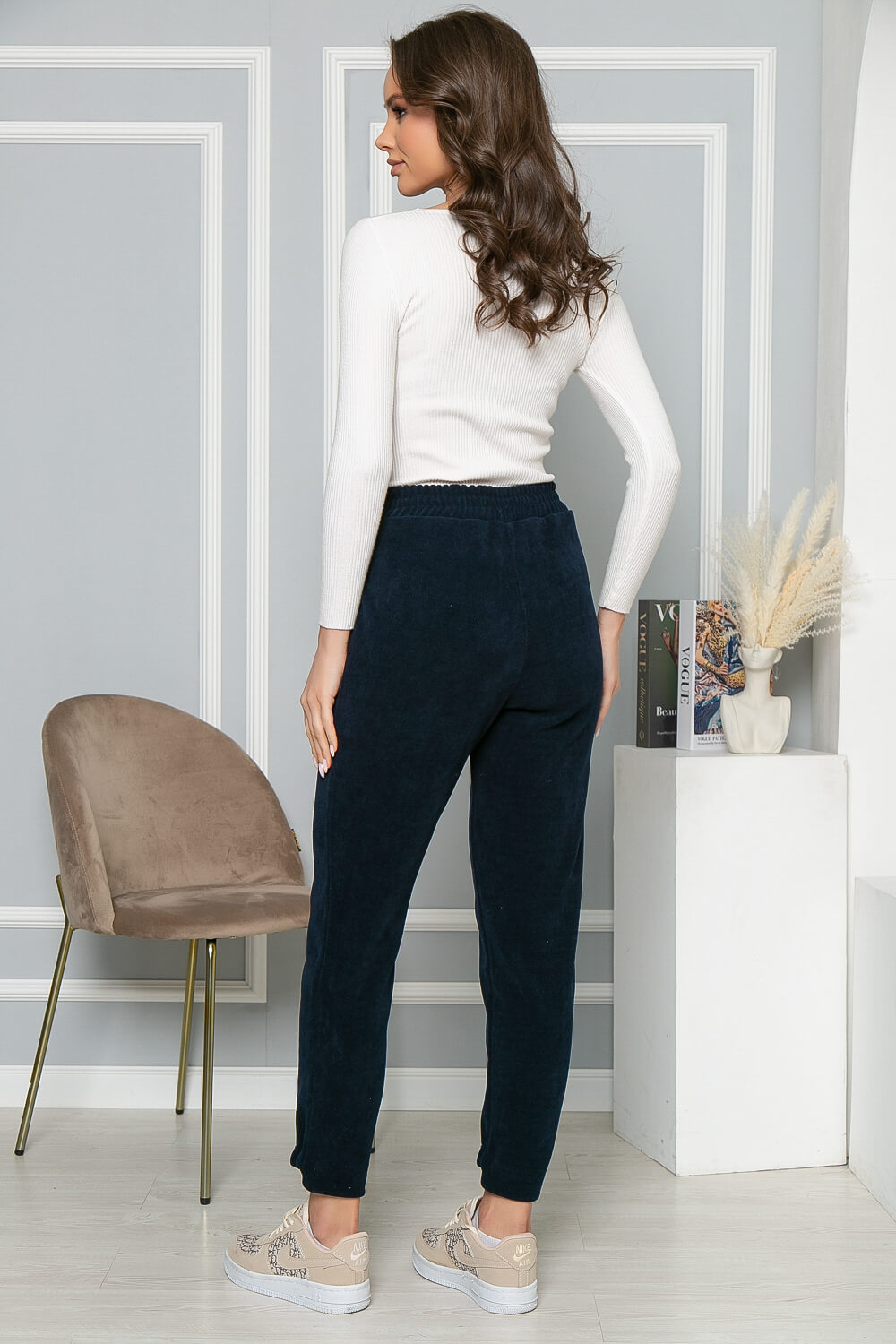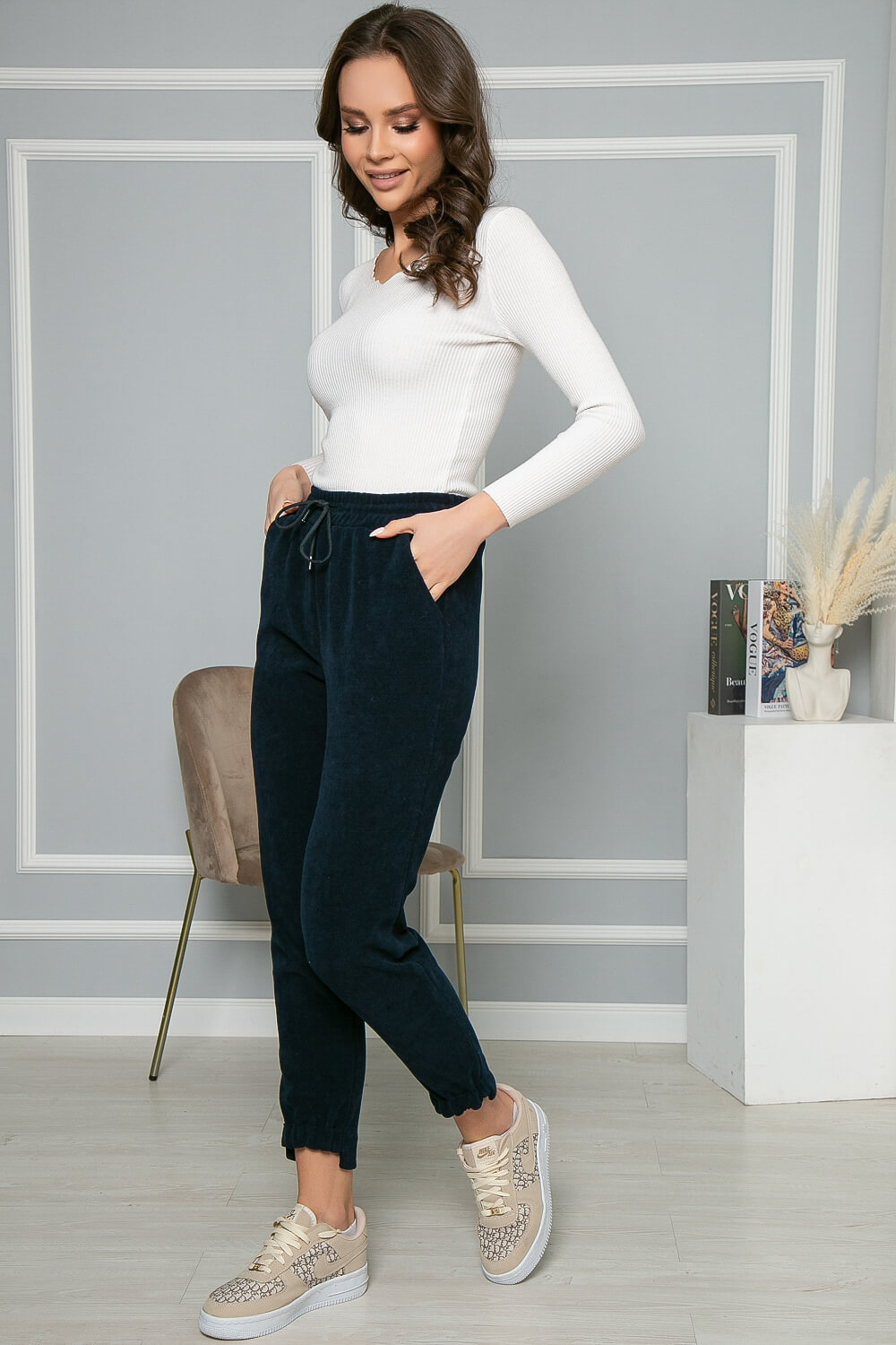 Практичные и комфортные брюки из вельвета. Резинка по низу брючин защитит от попадания ветра. Резинка на талии и зауженный крой брючин – интересное решение для тех, кто хочет подчеркнуть стройность ног. Брюки подойдут на каждый день, для офиса или прогулки. Данная модель прекрасно подойдёт на высокий рост.