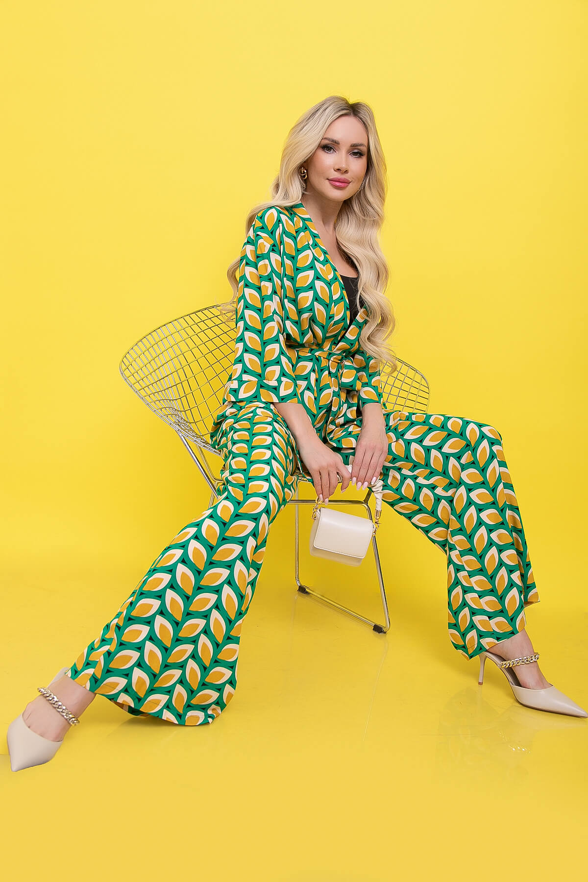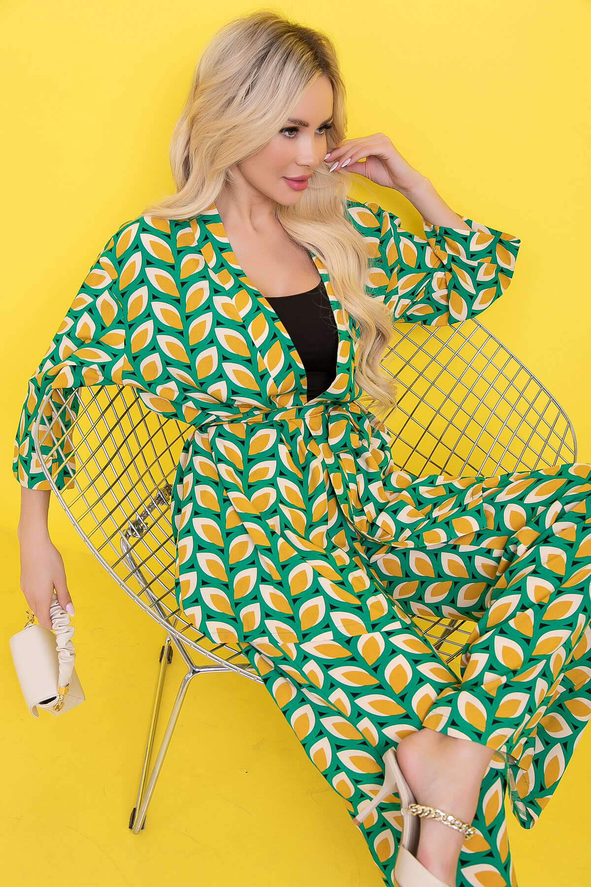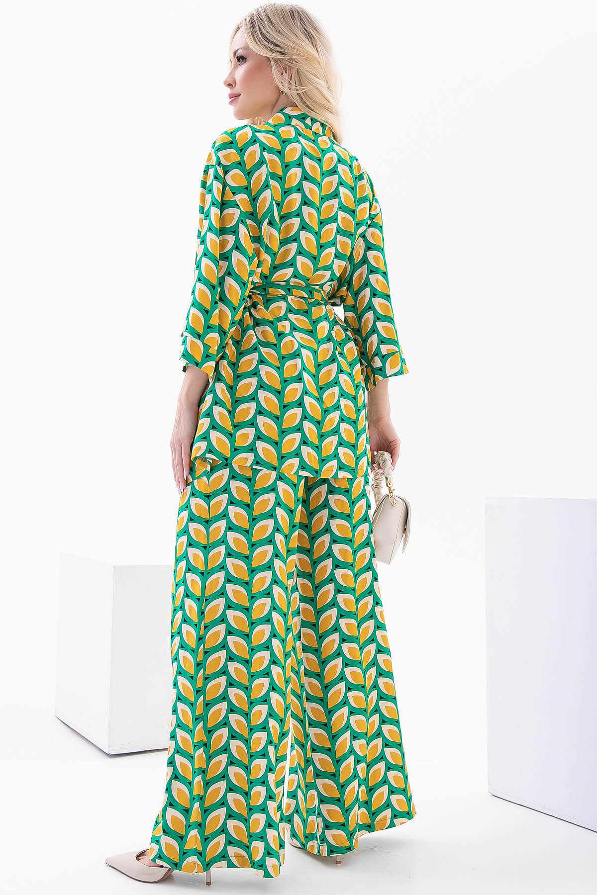 Костюм из лёгкой ткани идеально подойдёт для летнего расслабленного образа. Свободный крой не сковывает движений и дарит комфорт. Рукав укороченный со спущенным плечевым швом.В комплект входит пояс из основной ткани, который позволит подчеркнуть преимущества фигуры.
