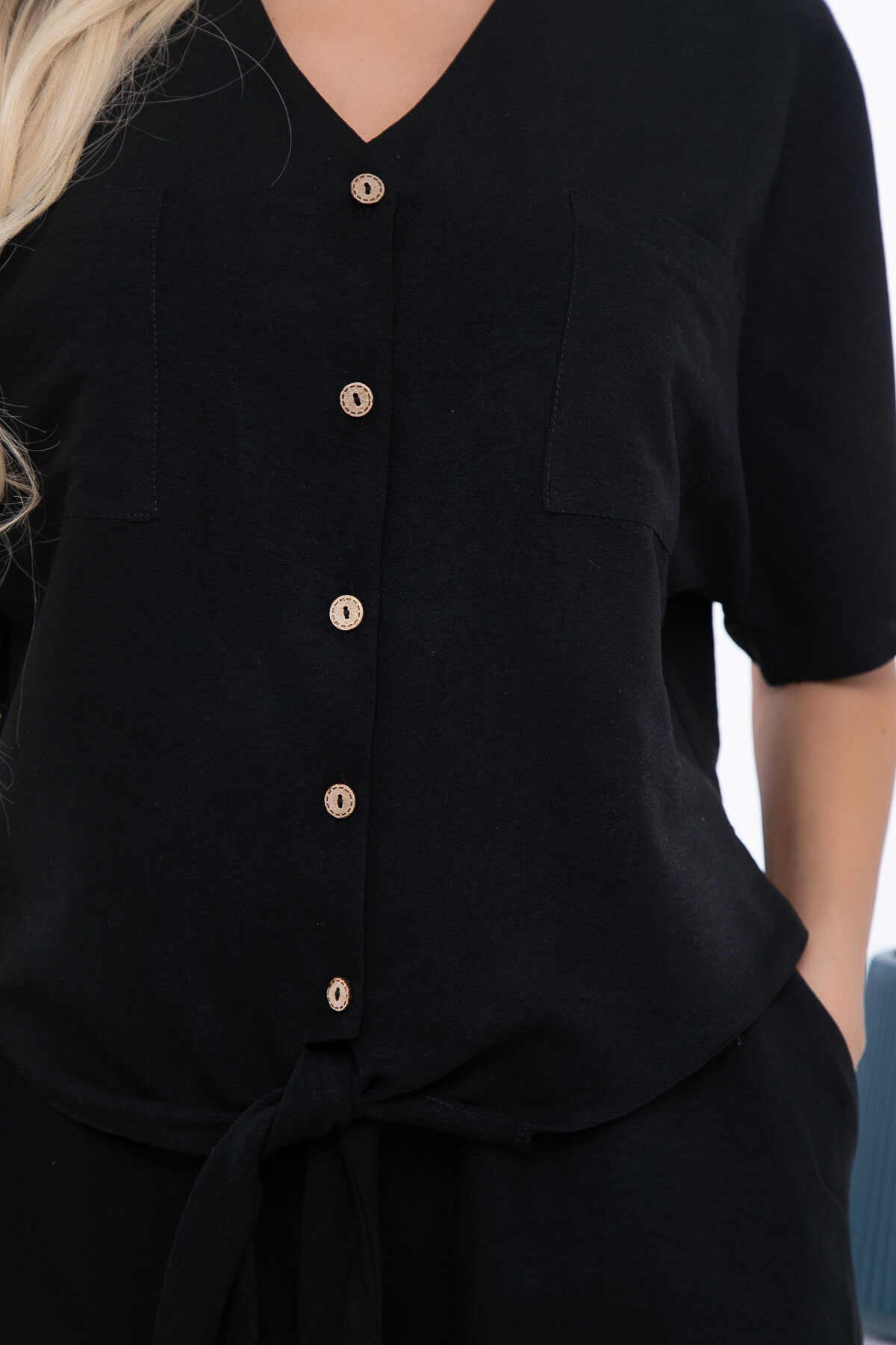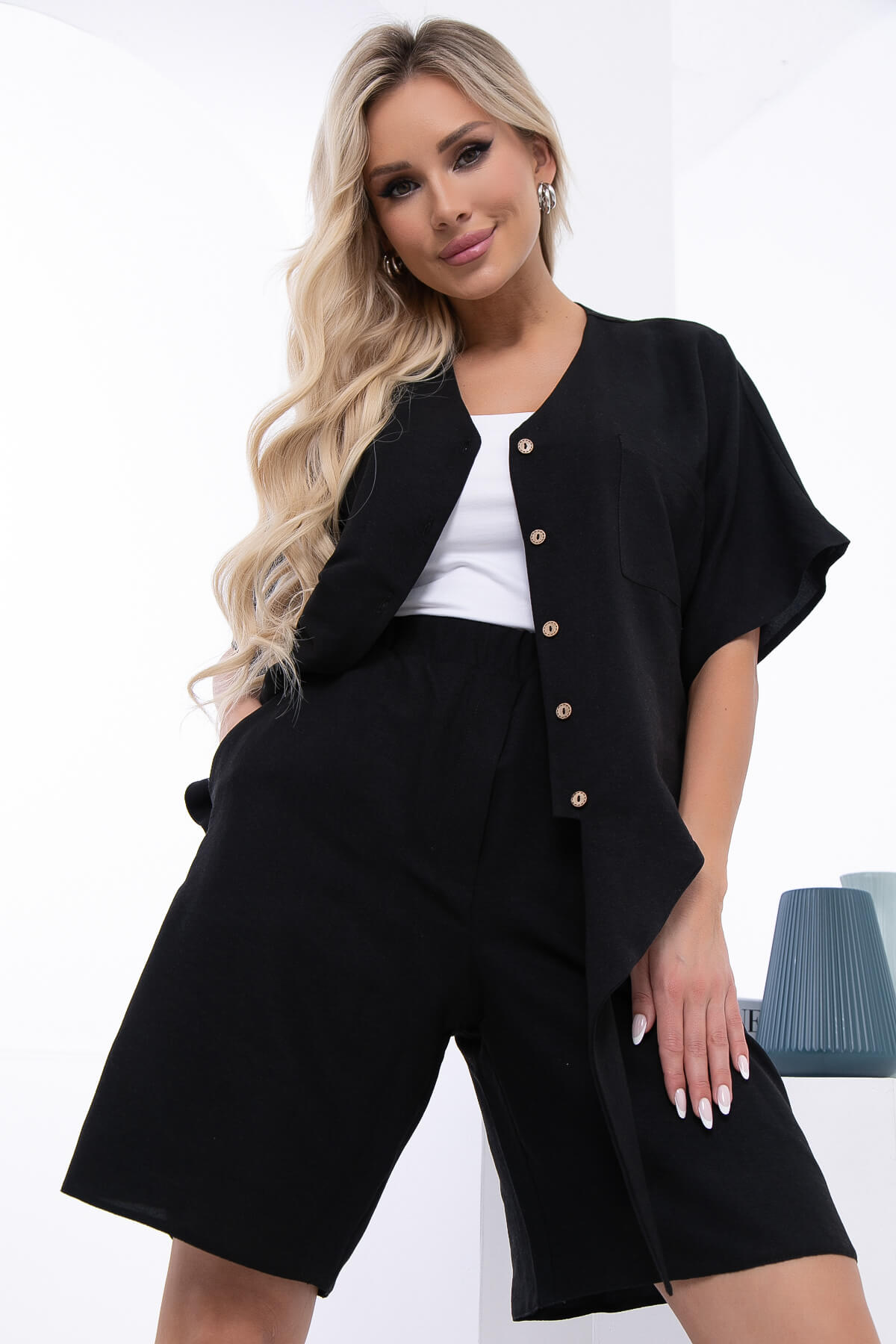 Идеальный тренд для тех, кто всегда в поисках стильных и модных, а главное удобных образов на лето! На пике популярности в этом сезоне комплект из свободной рубашки и прямых шорт. Рубашка свободного кроя на пуговицах с акцентными завязками по низу. Рукав укороченный, цельнокроенный. Шорты классические на резинке, есть карманы.