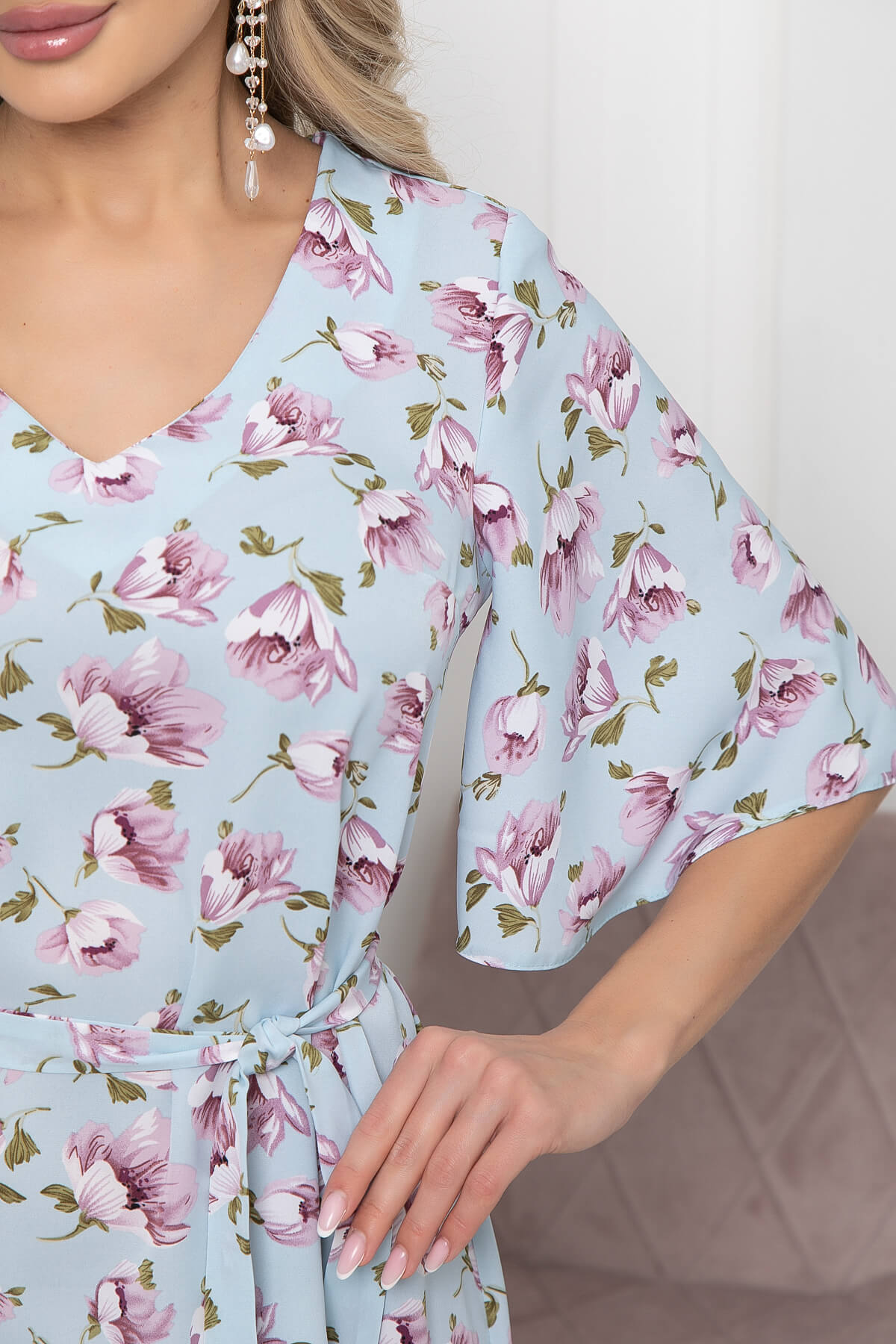 Невероятно нежное платье из легкой ткани отлично подойдет на каждый день. За счет своего принта, изделие отлично смотрится даже без украшений. Изюминку образу дополняют рукава по форме "волан". Преимущества фигуры подчеркнет пояс из основной ткани, который идет в комплекте.