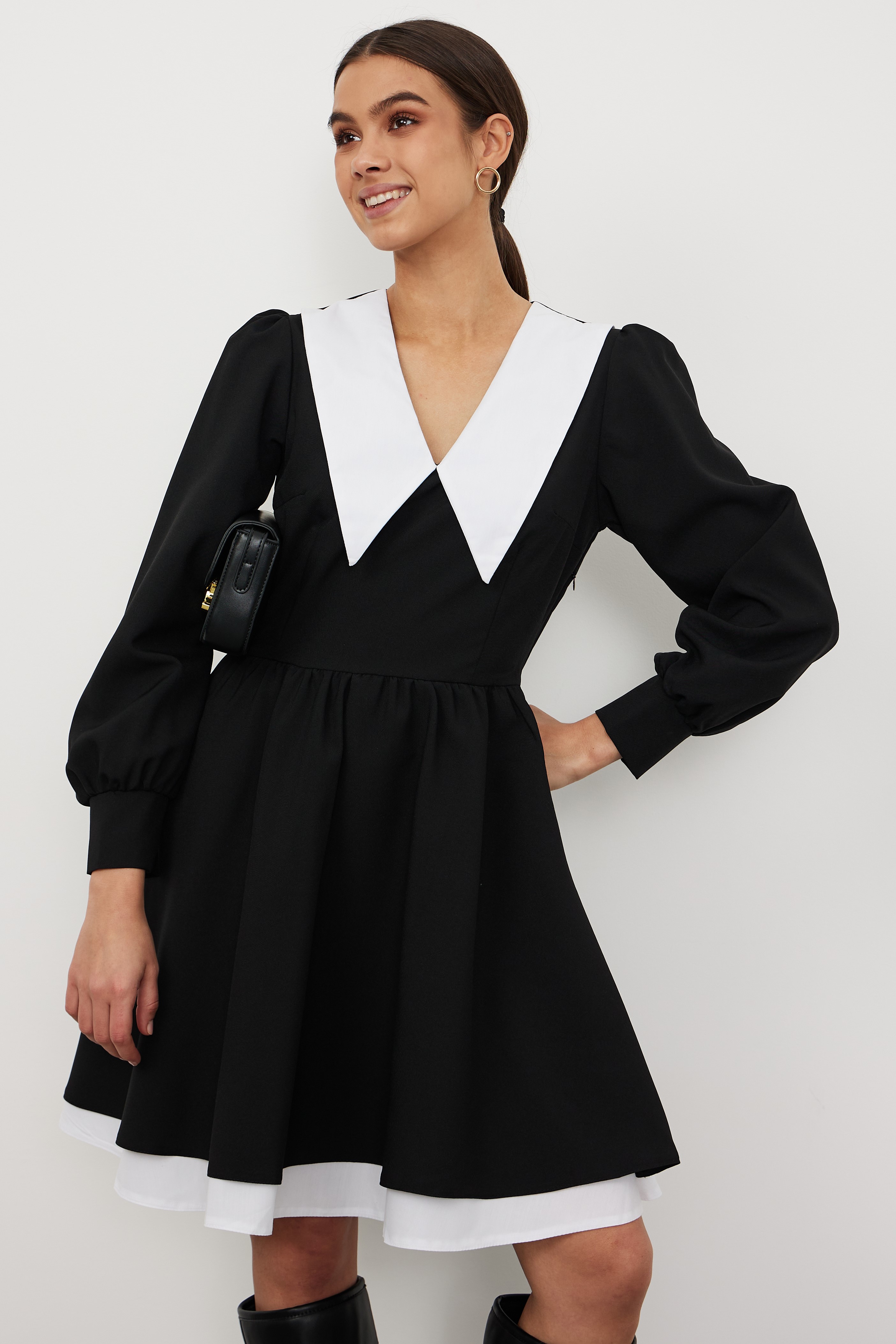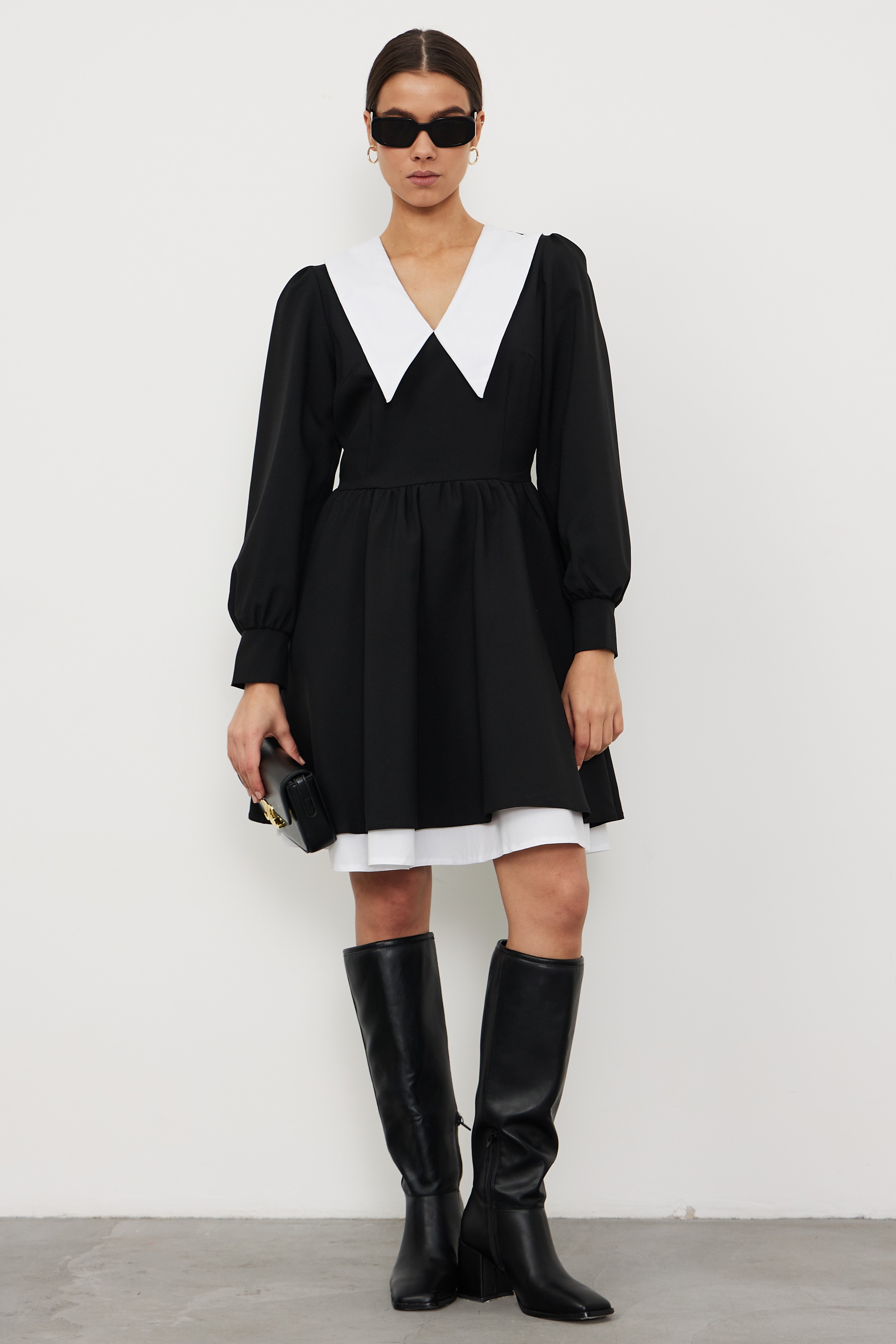 Черное платье с белым воротником и подъюбником НЕ СЪЕМНЫМ — это неотъемлемая часть вашего гардероба, которая считается классикой. Легкое воздушное платье с белым воротником с заостренными углами вытягивает визуально вашу шею, делая ее более длинной, изящной. Рукав фонарик длинный, юбка пышная свободная, декольте V-образное закрытое, молния сбоку, платье без пояса и принта, подъюбник и воротник не съемные. Данное трендовое платье считается школьное, повседневное, офисное, коктейльное, классическое, базовое. Для более высоких женщин платье будет длинной мини (короткое), но в разумных пределах (модель на фото 175 см). Для девушек маленького роста (невысоких) (менее 160) платье будет до колен. Платье подойдет каждой девочке-подростку, молодежи, школьницы. Покрой и ткань очень приятные к телу, что есть неотъемлемой частью выбора. Сочетание нашего платья с красивой обувью и аксессуарами автоматически подойдет для любого праздника: выпускной, свадьба, выписка и многие другие торжества. Но также можно его надевать и в школу на последний звонок или 1 сентября, и на работу, и просто на прогулку с подружкой или с детьми.