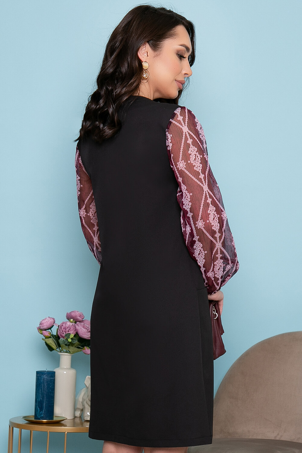 Платье из костюмной ткани, в классическом чёрном цвете, прямого силуэта с утончёнными шифоновыми рукавами. По переду отрезная деталь, со стильными и удобными кармашками. По спинке замок. Платье без подкладки.