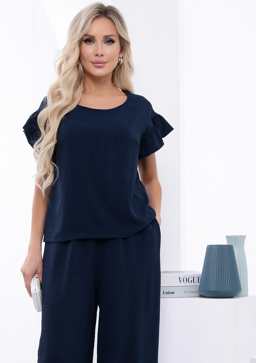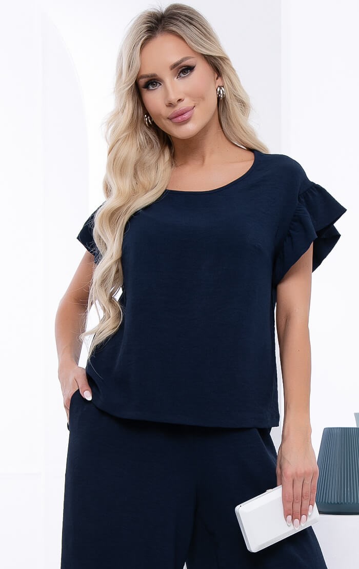 Блуза прямого кроя в базовом цвете. Акцентной деталью являются летящие рукава-воланы, которые умело добавят образу непринуждённой лёгкости. Данная модель комбинируется практически с любым низом, будь то брюки, юбка или летние шорты.