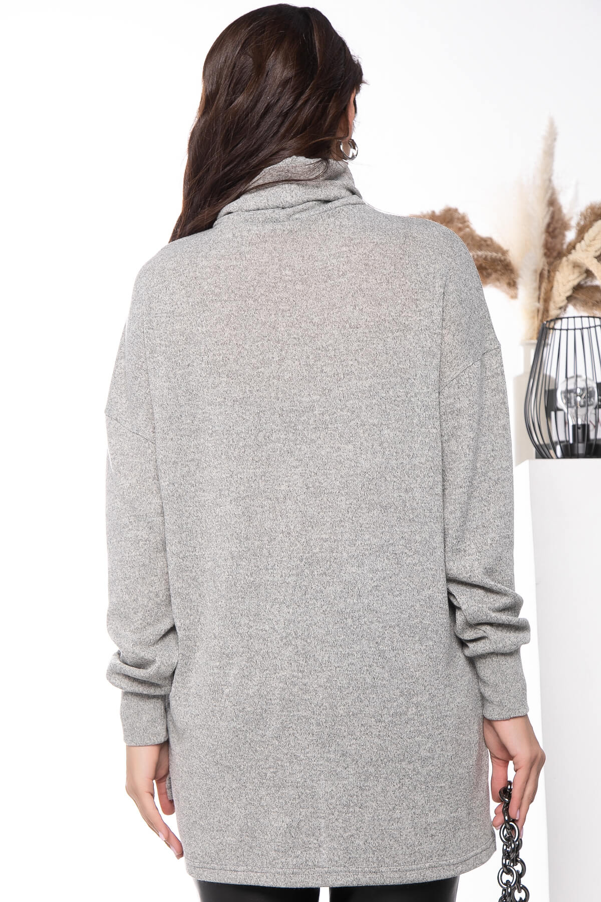 Горловина оформлена воротником "Хомут". По бокам джемпера есть разрезы.