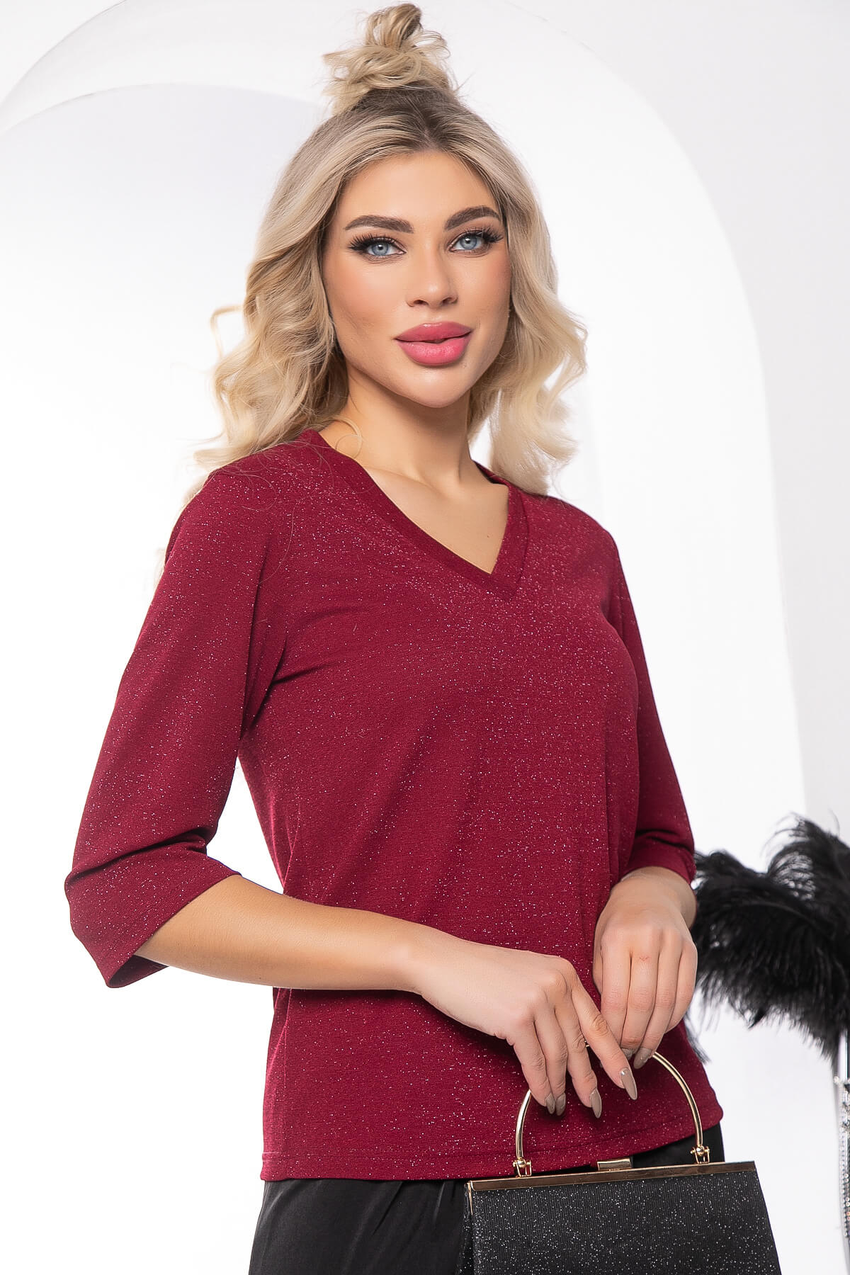 Джемпер прямого кроя серебряного цвета. В составе ткани есть люрексная нить, благодаря которой достигается эффект лёгкого мерцания. Джемпер имеет втачной, укороченный, свободный рукав.