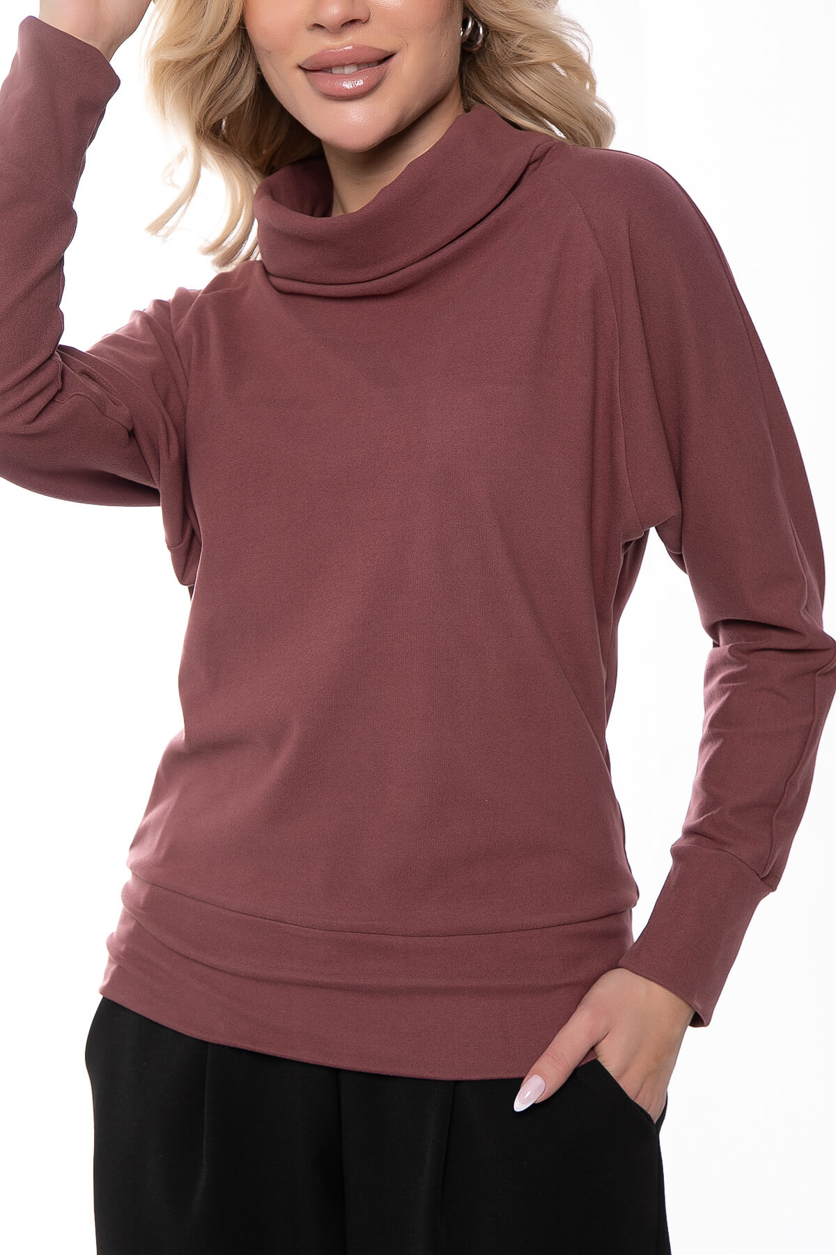 Тёплый и уютный джемпер из мягкого трикотажа. Джемпер хорошо будет смотреться в сочетании с облегающими брюками или лосинами. Рукав втачной, скроен по типу "летучая мышь",по низу манжет. Горловина оформлена воротником "Хомут". По низу изделия притачной пояс.