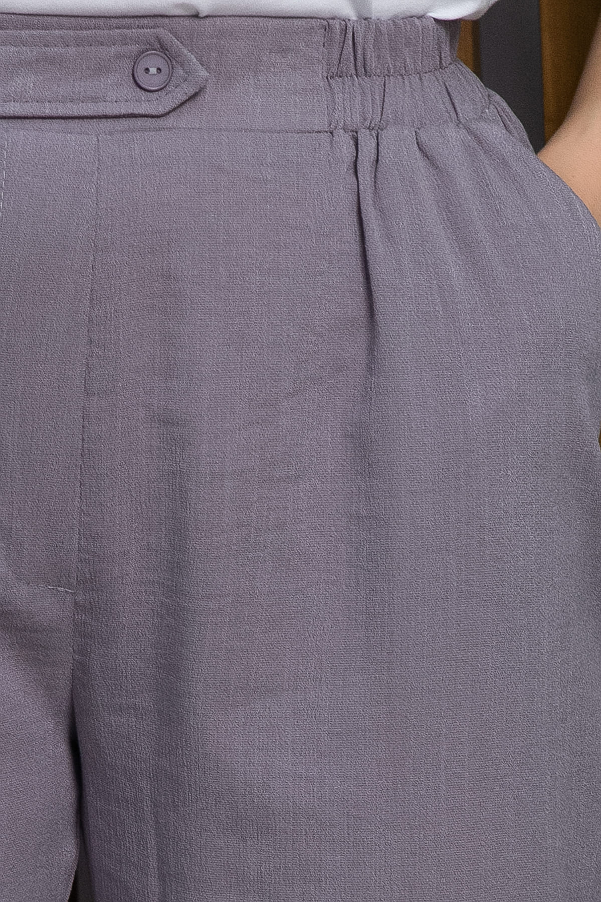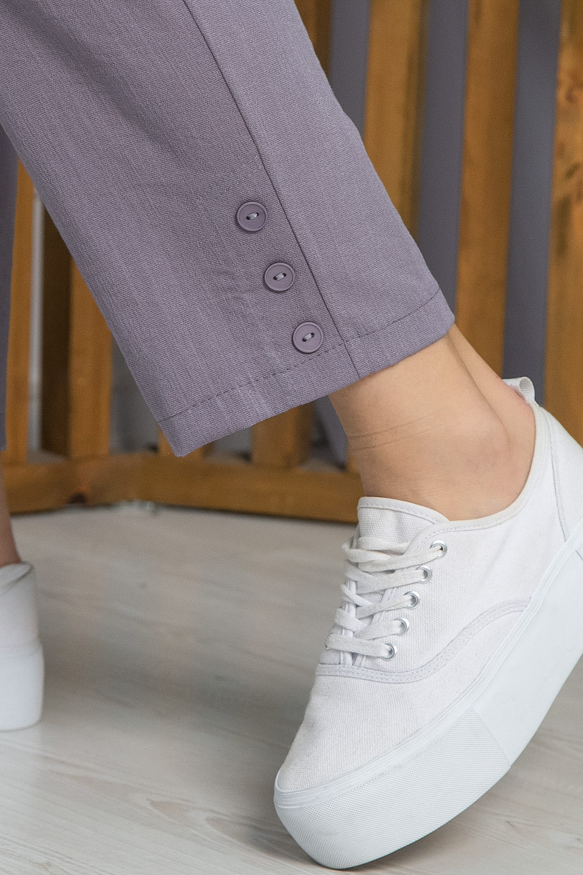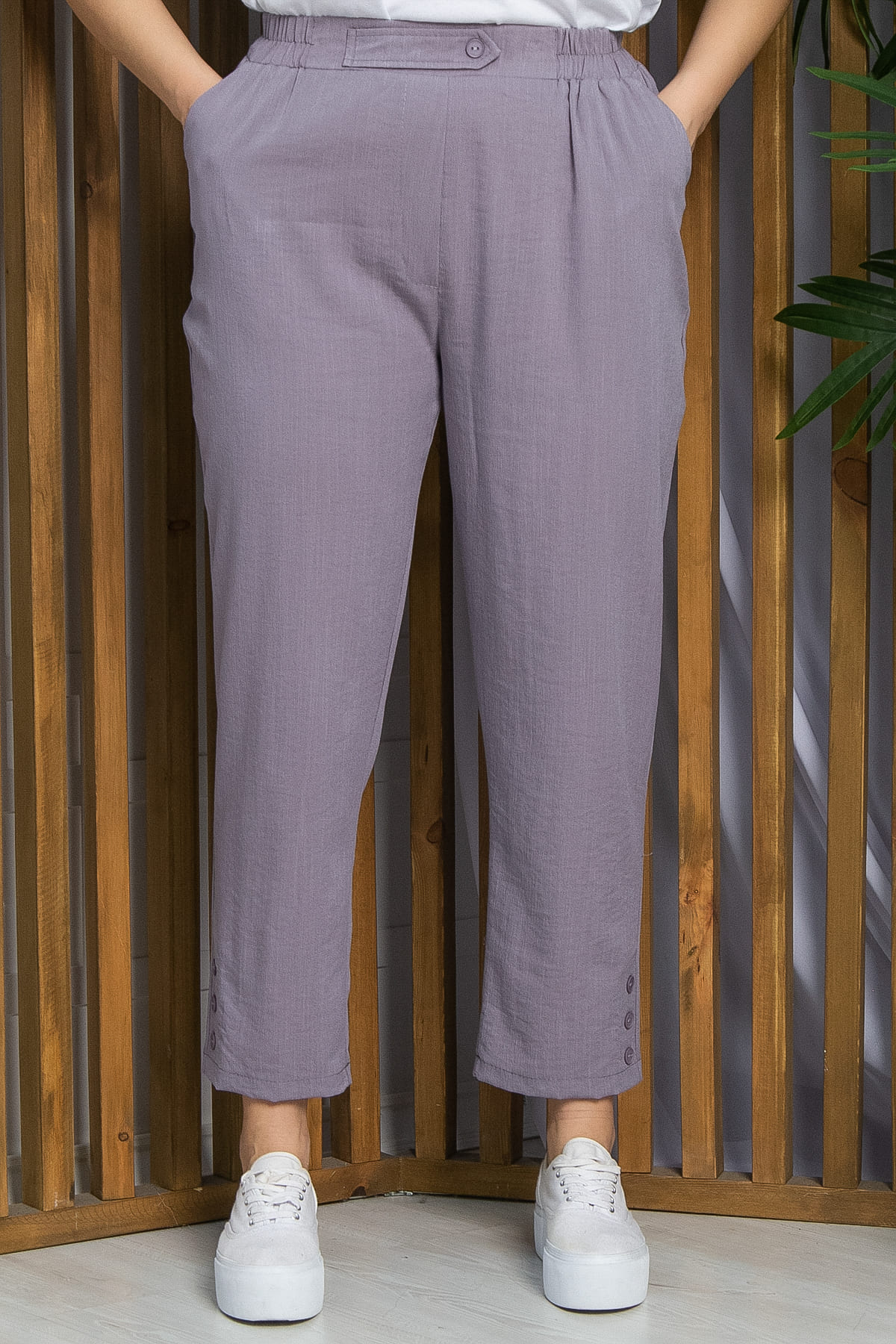 Летние лёгкие брюки-бананы — прекрасный выбор для повседневного образа. Брюки с притачным поясом на резинке, с декоративной патой по переду пояса, в боковых швах карманы. Брюки слегка заужены к низу. По боковому шву по низу имитация шлицы на пуговицах.