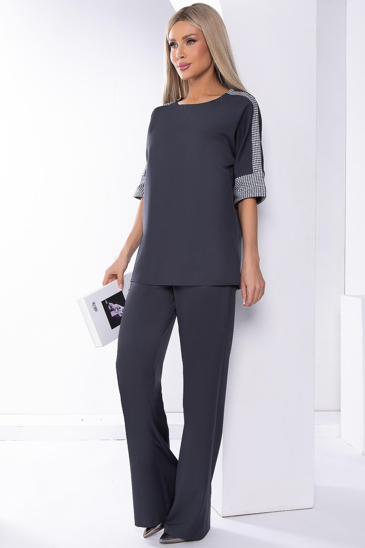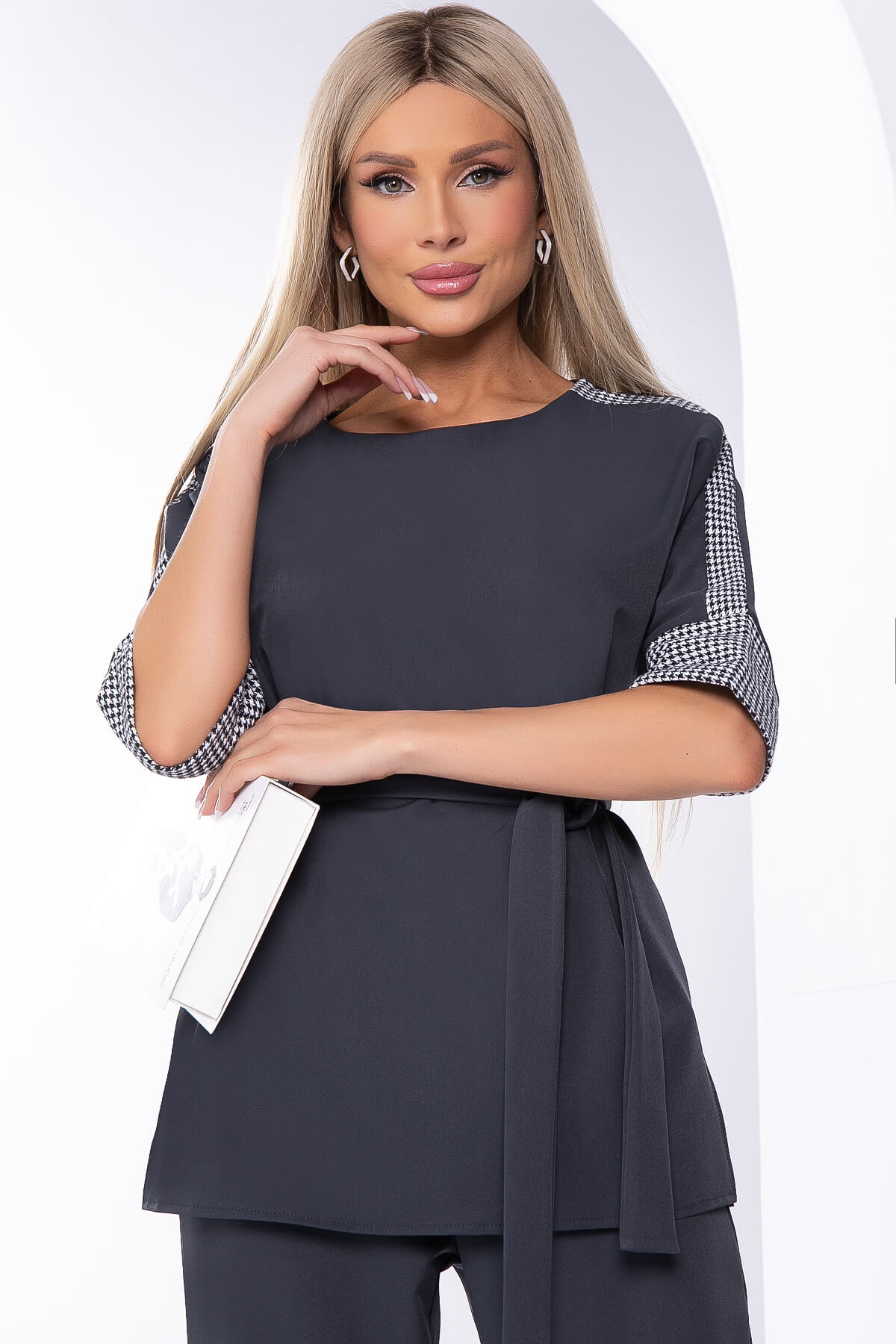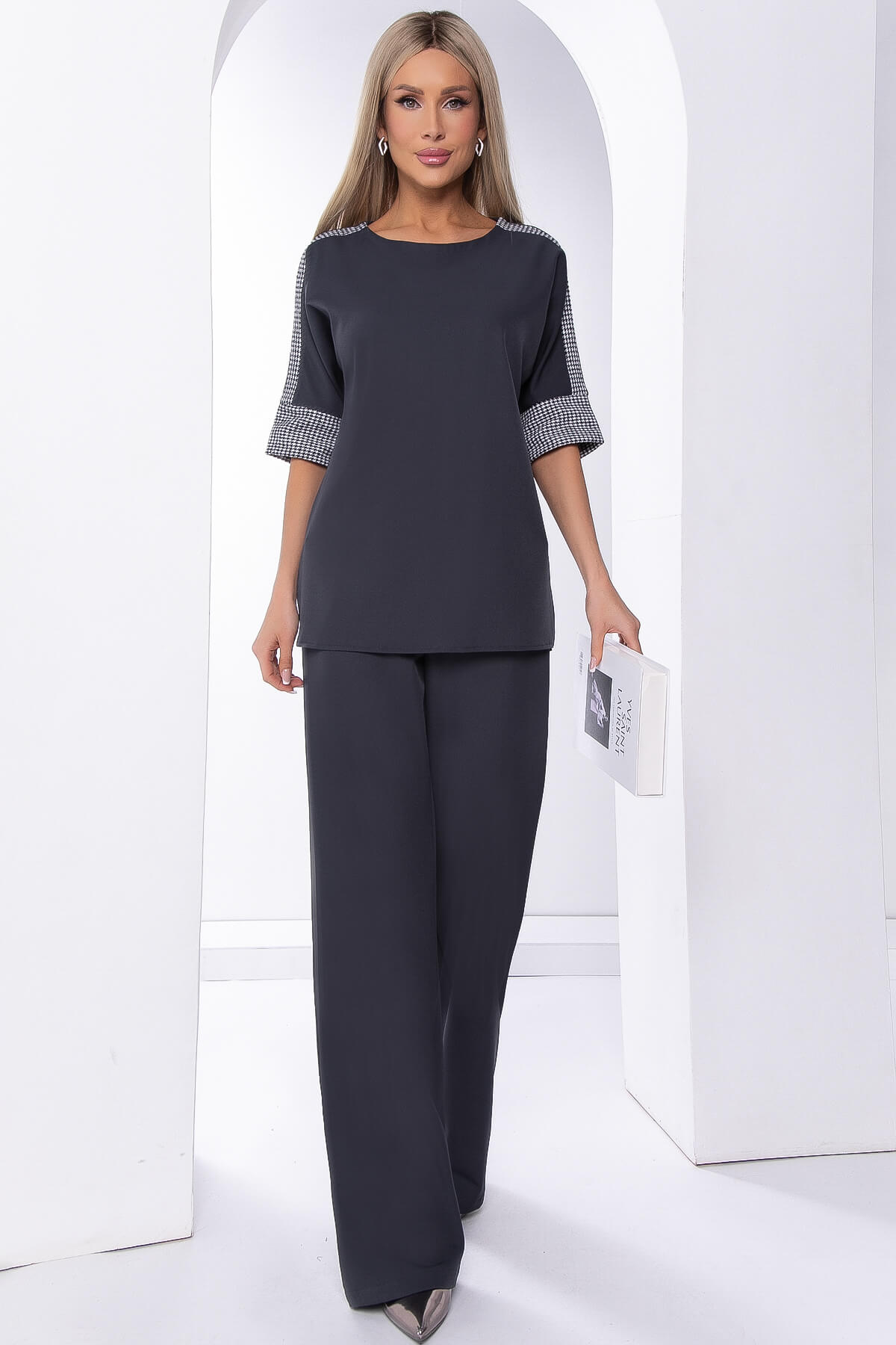 Костюм-двойка, состоящий из классических брюк прямого кроя и блузы прямого кроя. Данный комплект можно носить, подчеркнув талию поясом из основной ткани или же, заправив блузу. В обоих вариантах костюм будет смотреться интересно. Брюки по талии на резинке, в боковых швах есть карманы. Блуза прямого кроя, по бокам есть разрезы. Пояс из основной ткани входит в комплект.