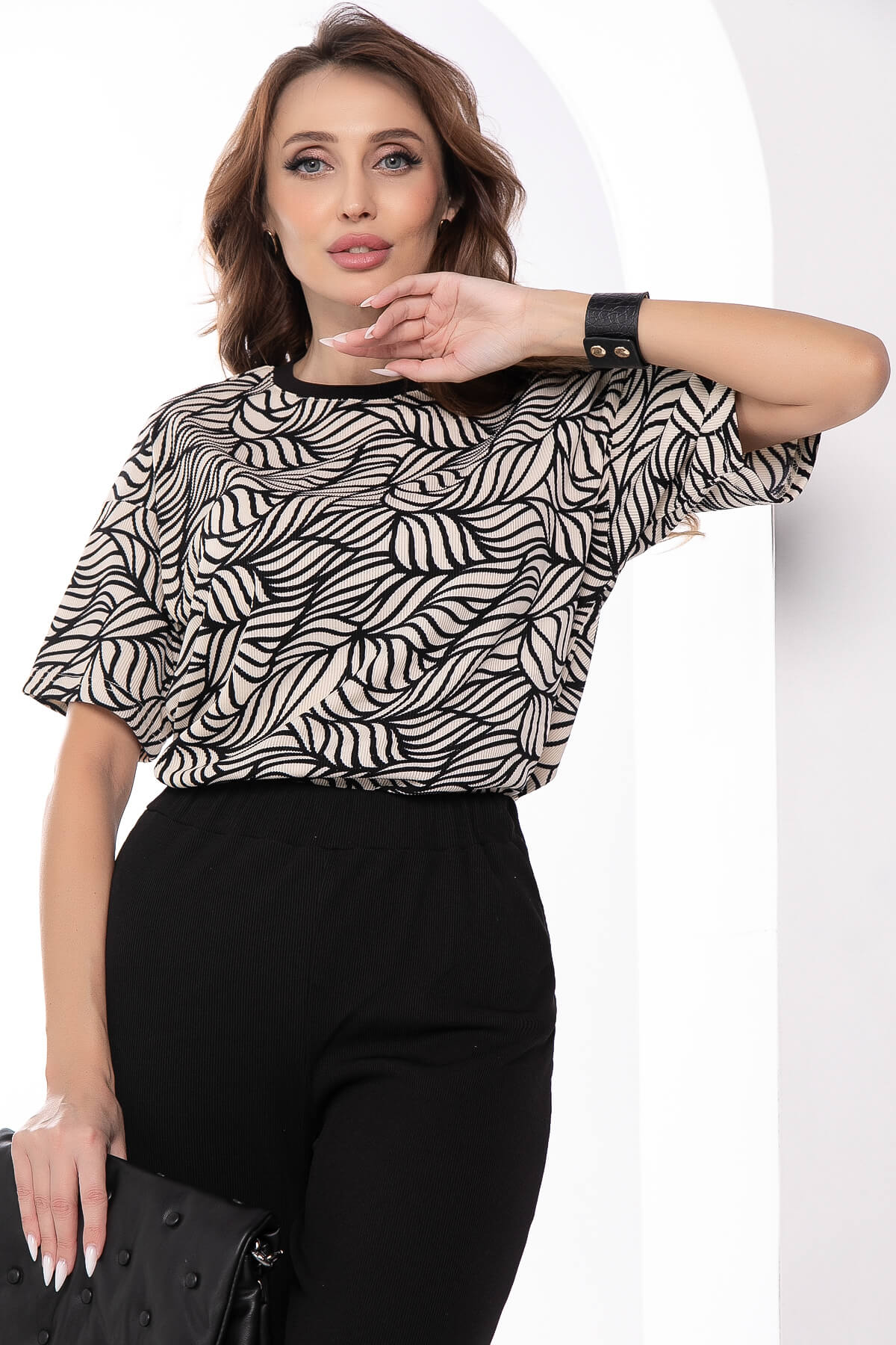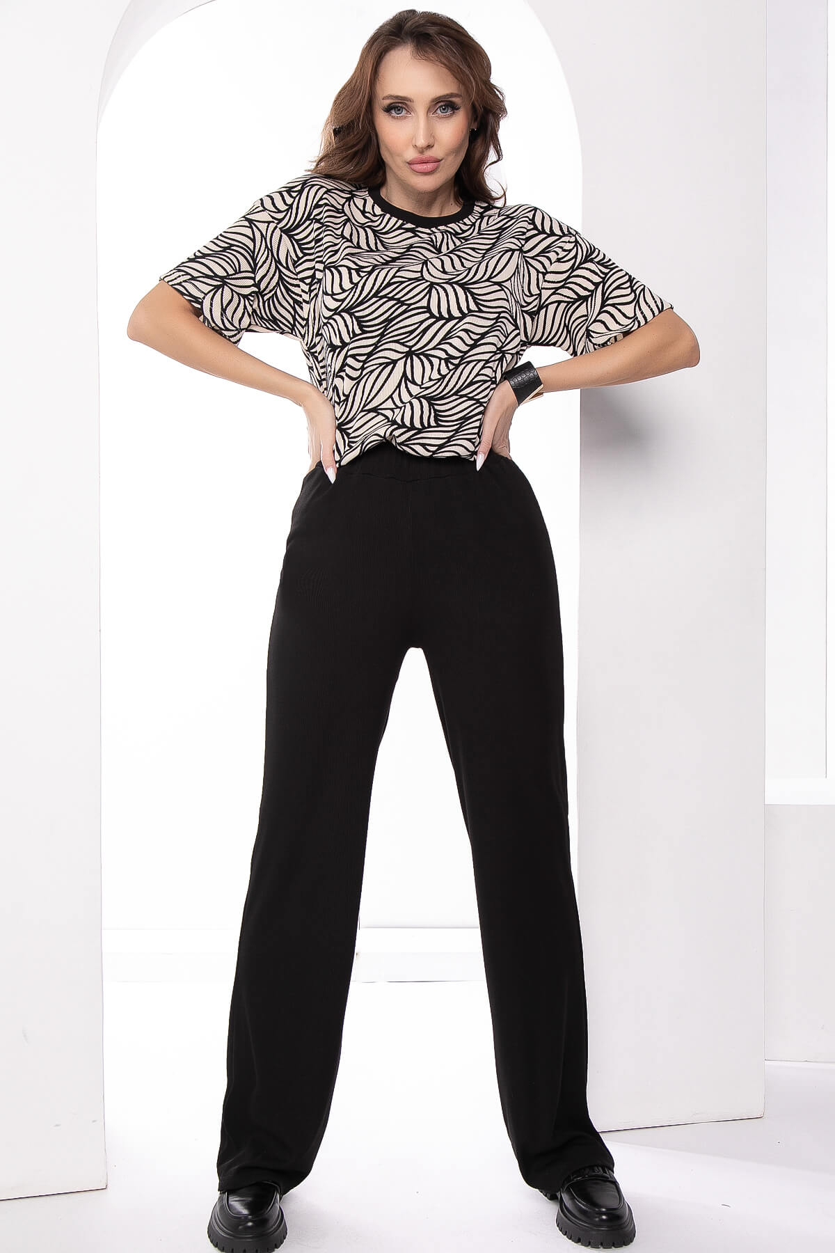 Костюм-двойка, состоящий из прямых брюк с высокой посадкой на резинке и джемпера свободного кроя. Преимущество комплекта в том, что вы сможете самостоятельно носить как джемпер, так и брюки. В повседневном образе смело сочетайте с лоферами или ботинками, а если нужен более официальный образ, с туфлями на каблуке.