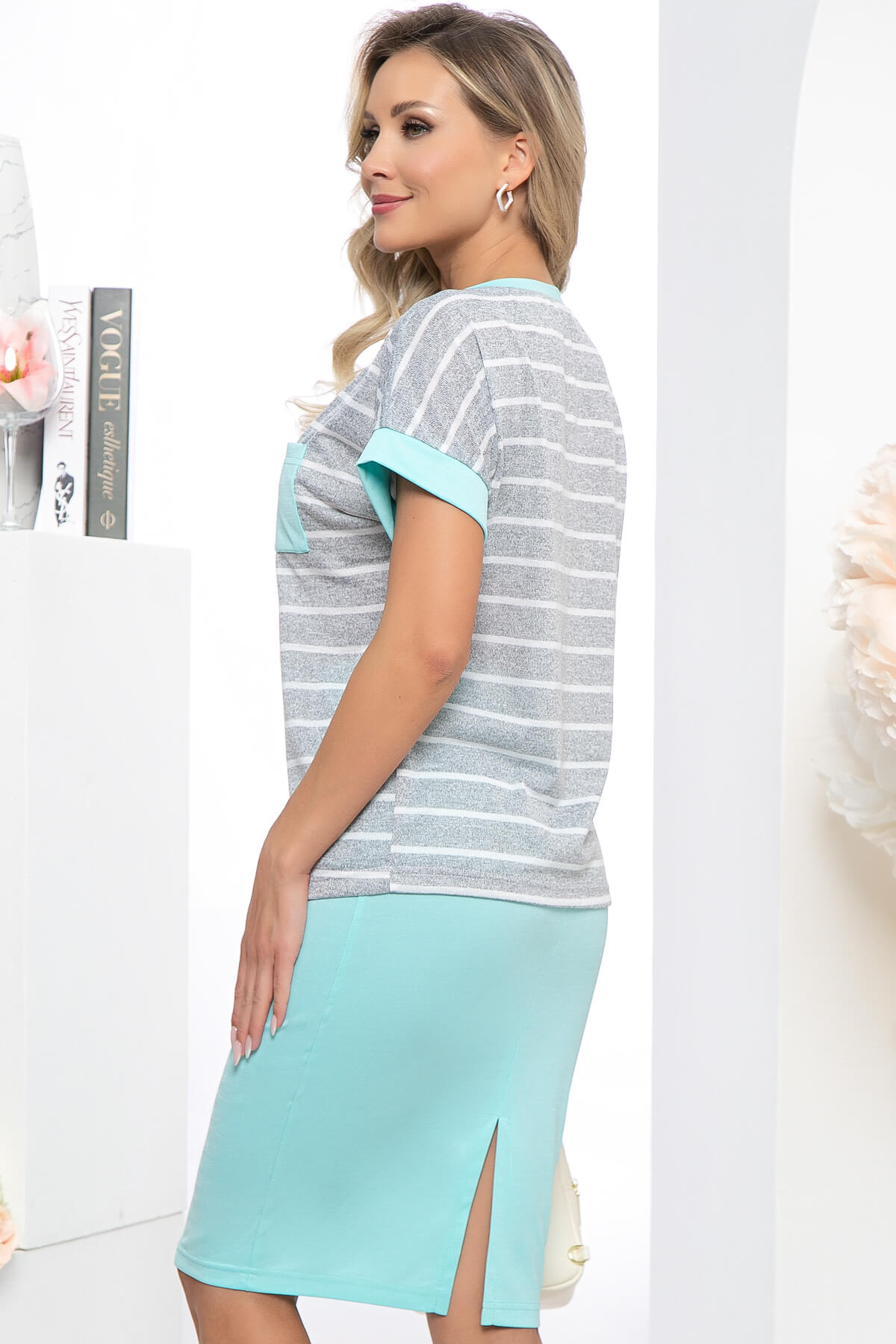 Элегантный костюм на каждый день, состоящий из двух предметов: юбки и блузы свободного кроя. Юбка, манжеты блузы и кармашек выполнены из однотонного трикотажа мятного цвета. Универсальная блуза идеально будет сочетаться так же с брюками и джинсами, а юбку можно так же комбинировать с базовыми топами или блузами.