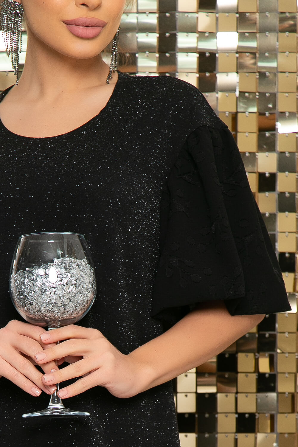 Платье полуприлегающего силуэта из трикотажа с люрексом. Платье имеет красивый рукав, который визуально уменьшат предплечья и делает силуэт стройнее и изящнее. Глубокий чёрный цвет погружает в мерцание ночных огней и атмосферу праздника. Изделие имеет классический округлый вырез горловины, по спинке внизу есть шлица. В комплект входит пояс из основной ткани.