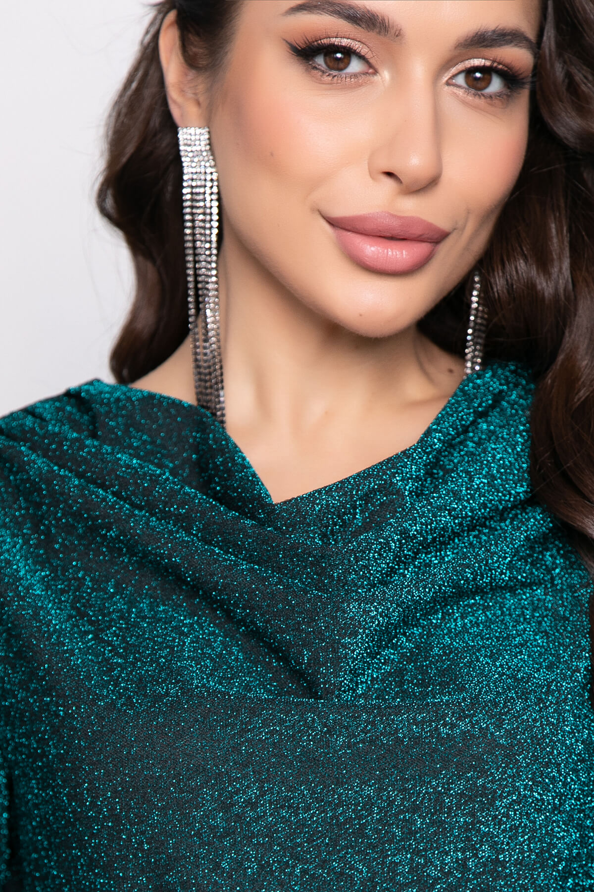 Вечернее платье прямого силуэта в красивом оттенке с невероятным мерцанием. Акцентом данной модели является горловина, скроенная по типу "качели". Рукав длинный, втачной. Изделие создано для того, чтобы быть в центре внимания!