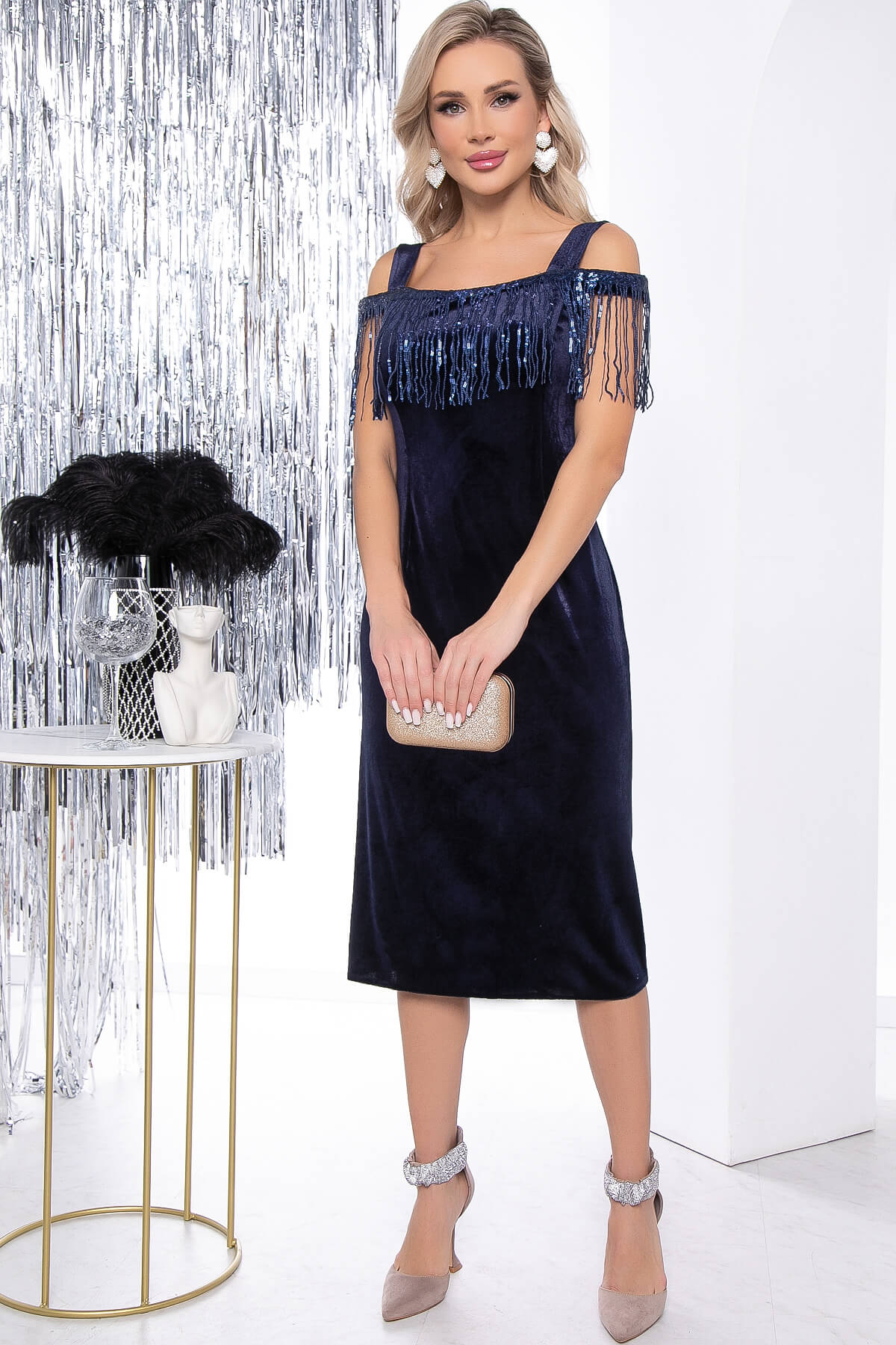 Вечернее платье прилегающего силуэта в красивом синем оттенке Акцентом данной модели является фигурный вырез, который не только красиво подчёркивает зону декольте, но и при помощи своей формы визуально удлиняет шею и стройнит овал лица. Изделие украшает бахрома с пайетками.