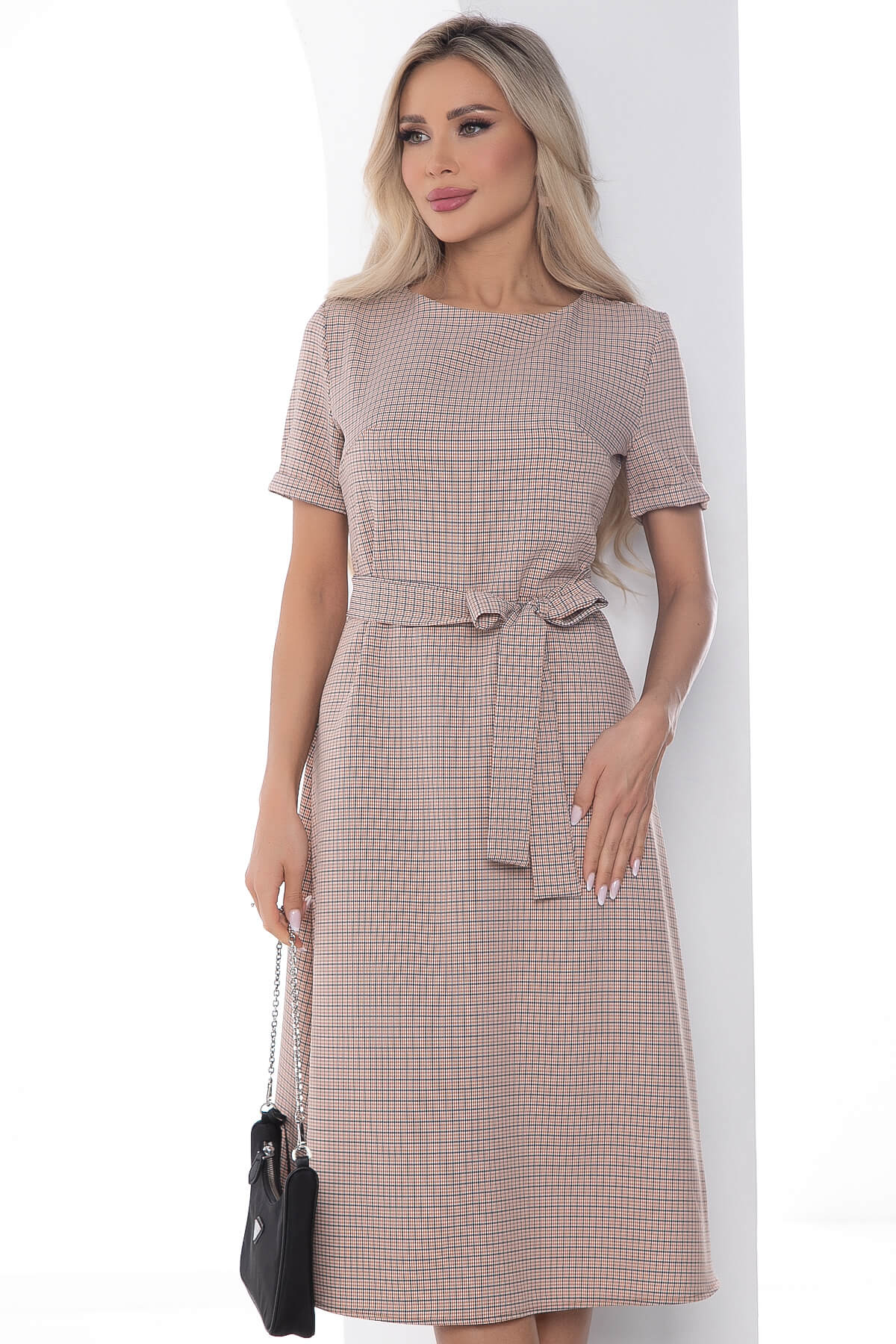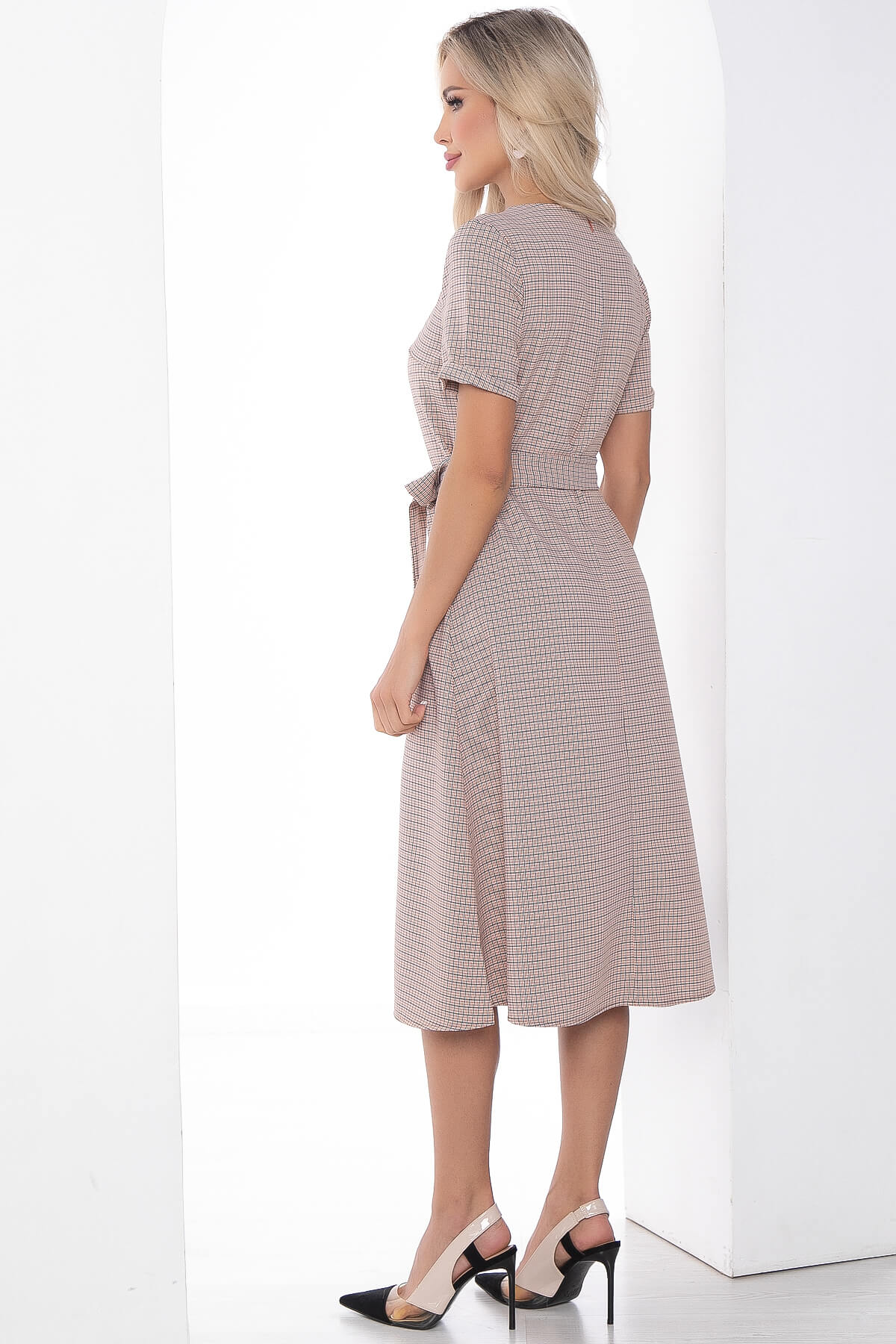 Платье в бежевом оттенке, прекрасный выбор на каждый день и на выход. Отлично дополнит ваш базовый гардероб. Рукав короткий с манжетом. В комплекте пояс из основной ткани.
