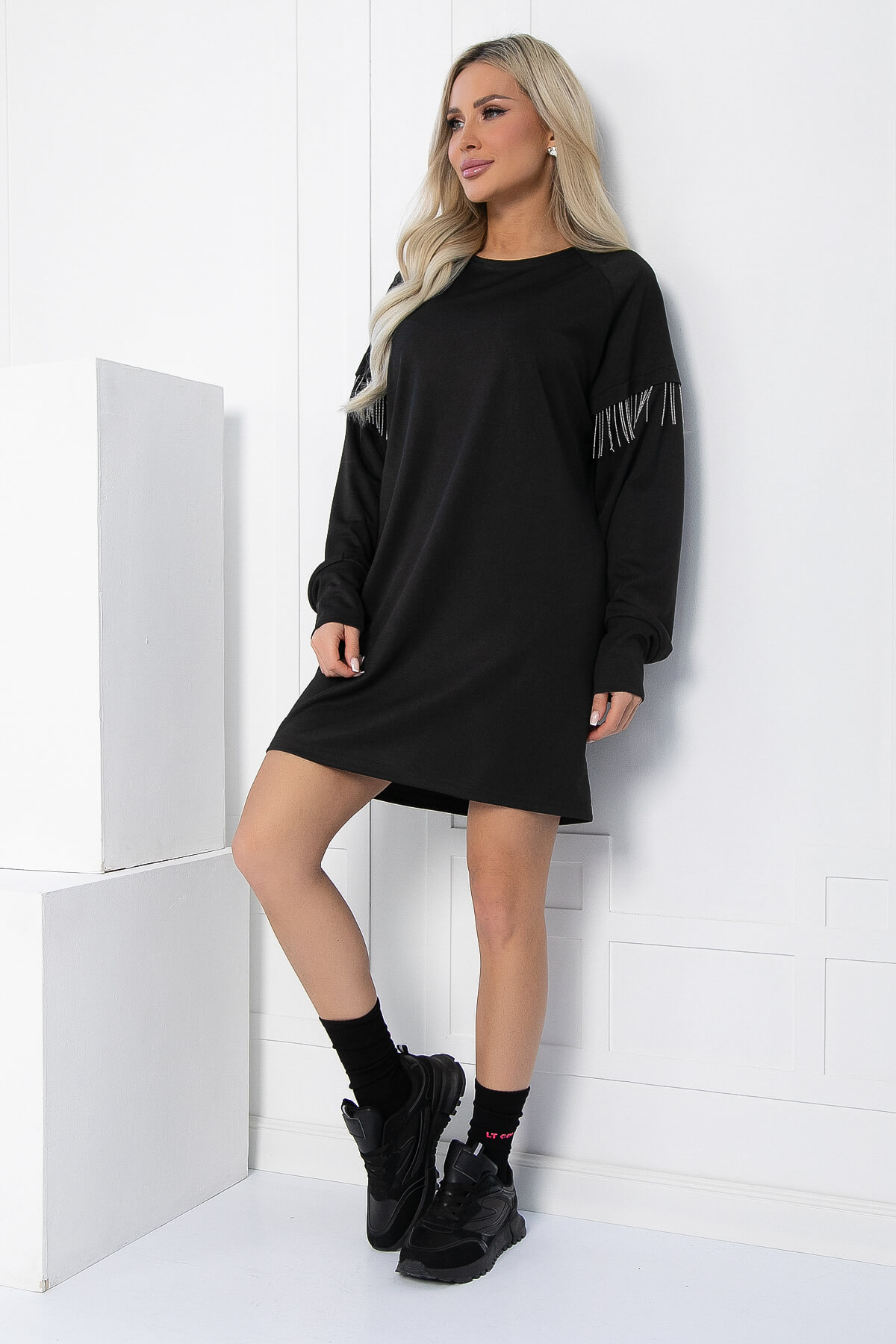 Трикотажное платье свободного кроя в чёрном оттенке — это отличный выбор для создания стильного и комфортного образа! Его отличительной чертой является эффектная металлическая бахрома, которая придаёт ему оригинальности. Модель оснащена удобными боковыми карманами. Элегантные рукава с высокой манжетой не только добавляют образу изысканности, но и защищают от холода.