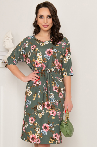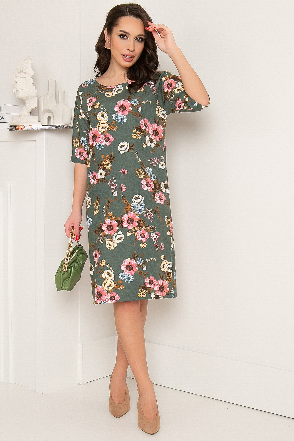 Женственное платье в красивом фисташковом оттенке с весенним принтом прекрасно подойдет для создания повседневного образа.